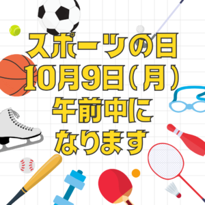 スポーツの日は祝日であり、多くの人がスポーツイベントやアクティビティを楽しむ日ですが、怪我や体の痛みは祝日に関係ありません。そのため、私たちは10月9日のスポーツの日も午前中は診療を行っております。健康に関するお悩みを抱える方々のサポートをお約束します。